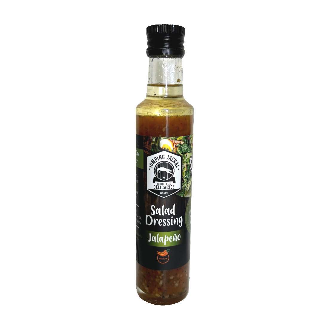 A medium spiced salad dressing contains a blend of multiple chili varieties, onions, olive oil and spices.